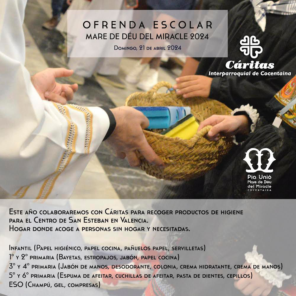 Un any més, aquesta ofrena col·laborarà amb Càritas per a arreplegar productes d’higiene per al centre de Sant Esteban de València.  Un lloc que acull a persones sense llar i necessitades.